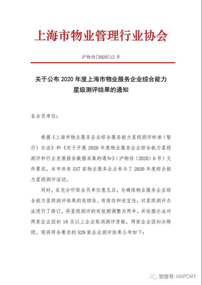 2020年6月9日,海鸿福船物业被上海市物业管理行业协会授予2020年度上海市物业服务企业综合能力星级测评为五星级企业,全市仅61家企业获此殊荣。